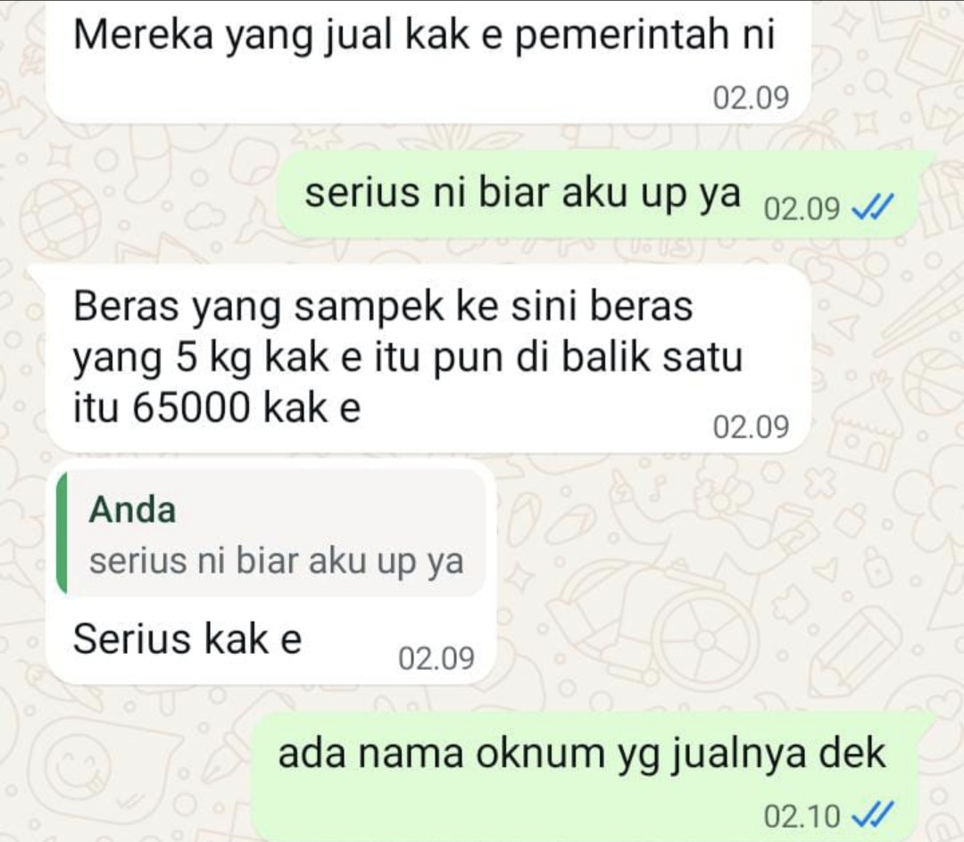 Informasi tersebut mencuat dari keluhan warga yang menemukan beras dengan ciri khas bantuan bencana justru beredar di kedai-kedai sekitar wilayah terdampak.