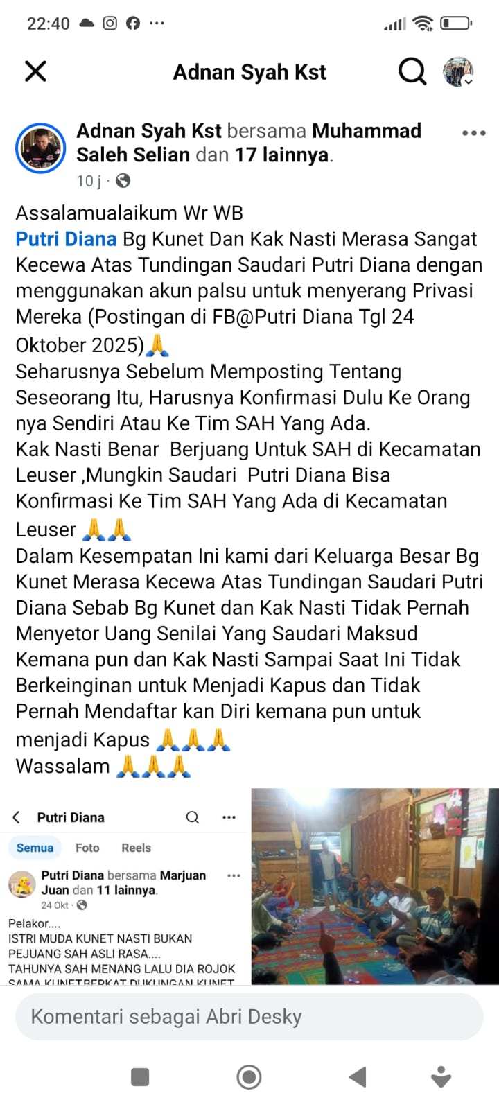 Aceh Tenggara – Suasana keprihatinan dirasakan oleh keluarga besar Bang Kunet dan Kak Nasti setelah beredarnya unggahan berisi tudingan yang dinilai tidak benar, dibuat melalui akun Facebook bernama “Putri Diana” pada 24 Oktober 2025. Unggahan itu bukan hanya memuat informasi yang tidak dapat dipertanggungjawabkan, tetapi juga dianggap menyerang privasi dan mencemarkan nama baik mereka.