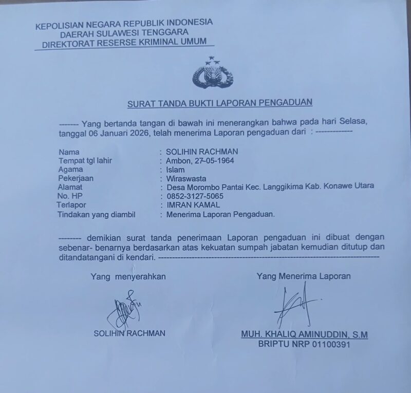 Kendari/Sultra 8 Januari 2026. | GPA SULTRA mendesak POLDA SULTRA segera memanggil dan memeriksa kepala desa Morombo pantai kecamatan langgikima kabupaten Konawe Utara berinisial(IK).